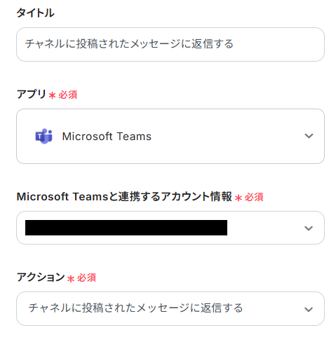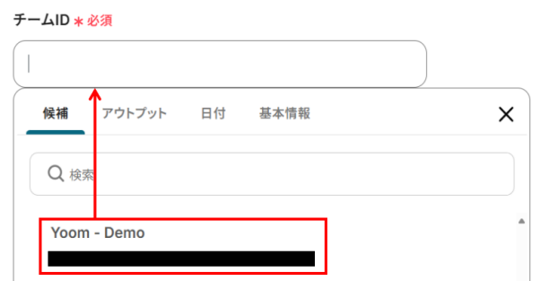 - チームID・チャネルID:入力欄をクリックすると、下記のような候補が表示されます。先ほど作成したMicrosoft Teamsのチームとチャネルを選択してください。