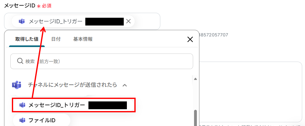 - メッセージID:こちらも入力欄をクリックし、「メッセージID_トリガー」を選んでください。