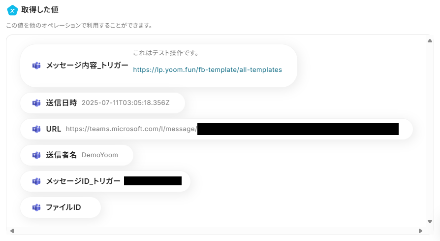すべて入力が完了したら、「テスト」を押します。テストが成功しましたら、Microsoft Teamsにデータが反映されているか確認してみましょう。