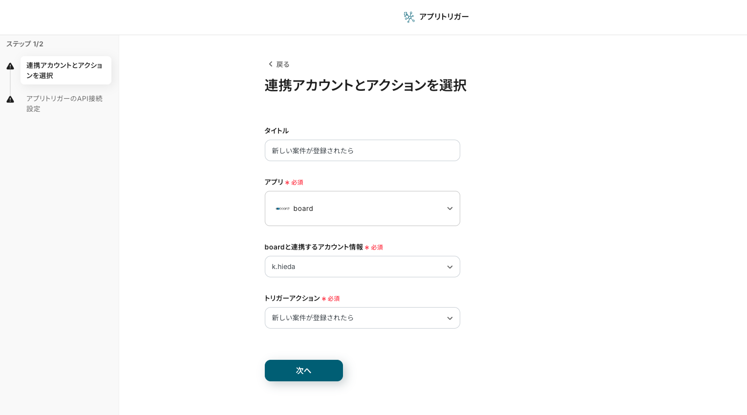 タイトルと連携するアカウント情報を設定し、アクションはテンプレート通りのまま「次へ」をクリックして進んでください。