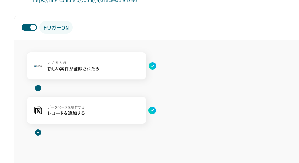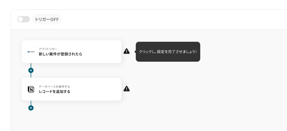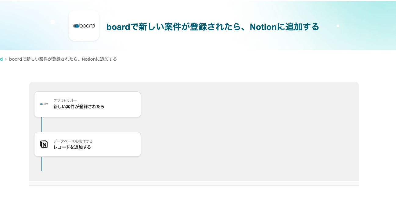 boardに新しい案件が登録されたことをアクションの起点として利用し、Notionのデータベースに情報を自動で追加することで、手動での転記作業をなくし入力ミスや共有漏れを防ぎます。