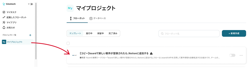 コピーしたテンプレートは、マイプロジェクトに追加されます。マイプロジェクトは左のメニューバーからアクセス可能です。