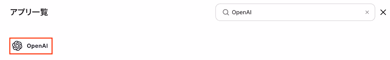 新規接続をクリックしたあと、アプリのメニュー一覧が表示されるのでOpenAIと検索し対象アプリをクリックしてください。