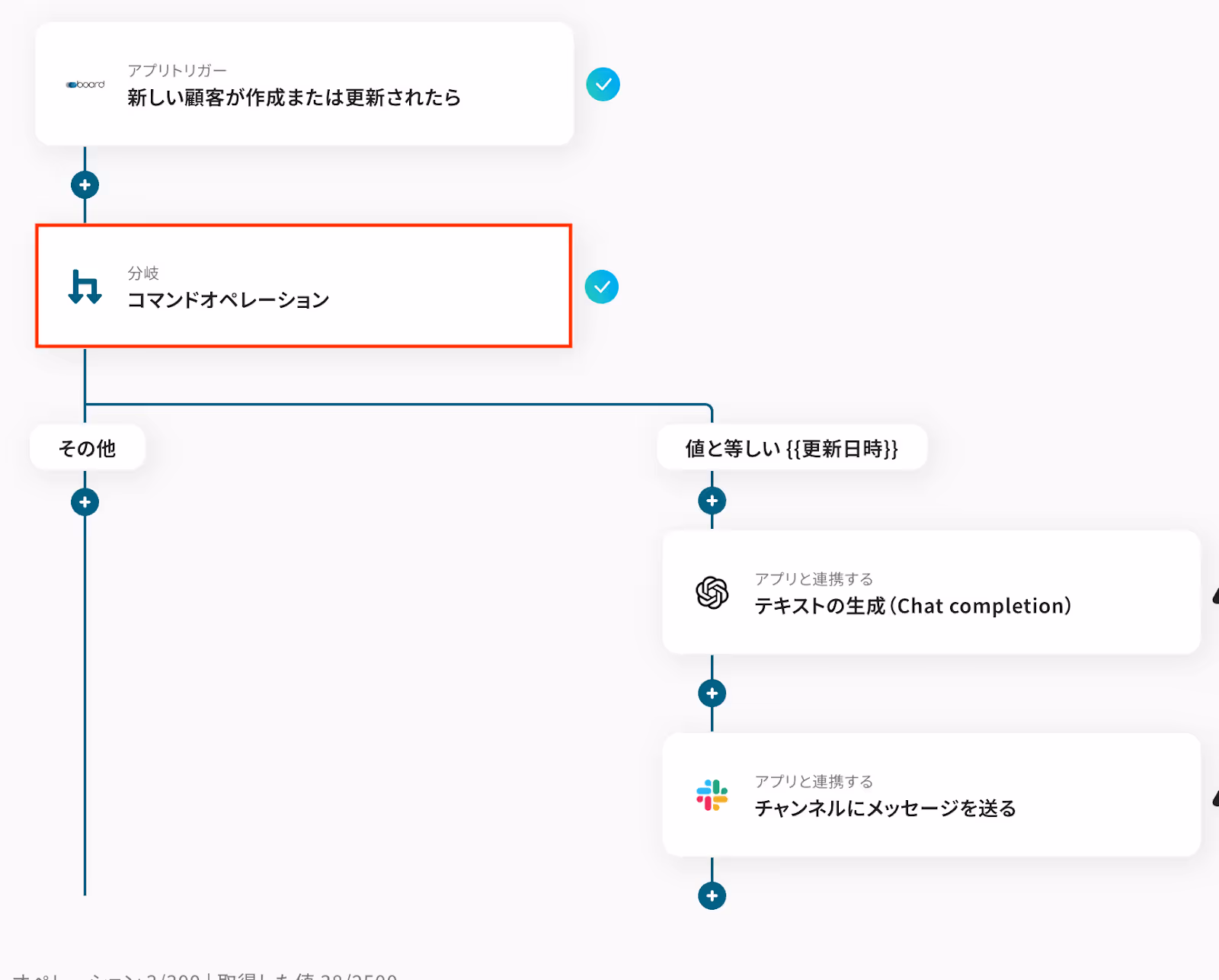 boardで新しい顧客が作成された場合にのみ処理を行うよう、分岐条件を設定します。