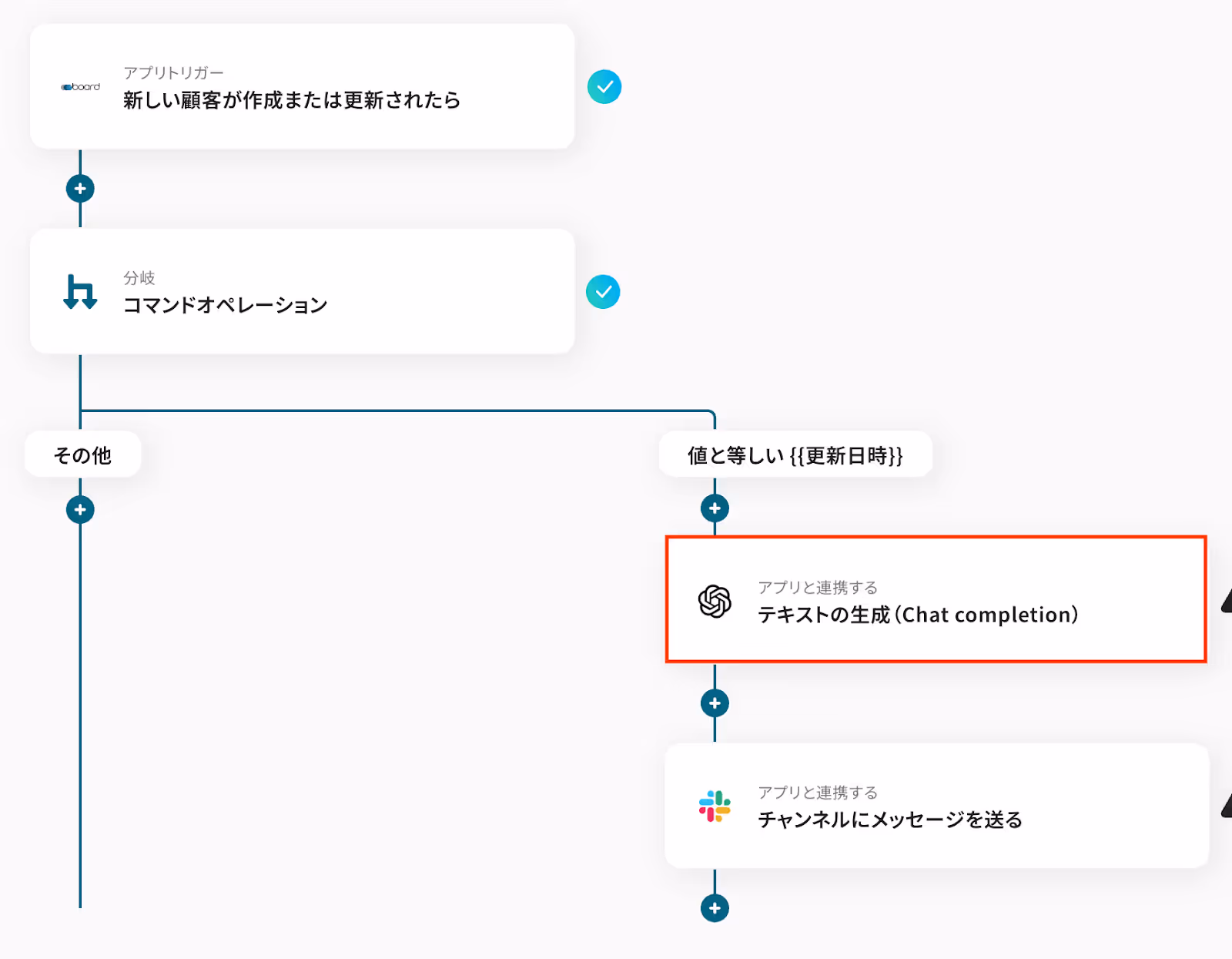 テキストの生成アクション以下で+ボタンをクリックし、boardの「顧客の更新」アクションを追加してください。そこで要約結果を指定のフィールドにマッピングすることで、生成された要約をboardに保存できます。