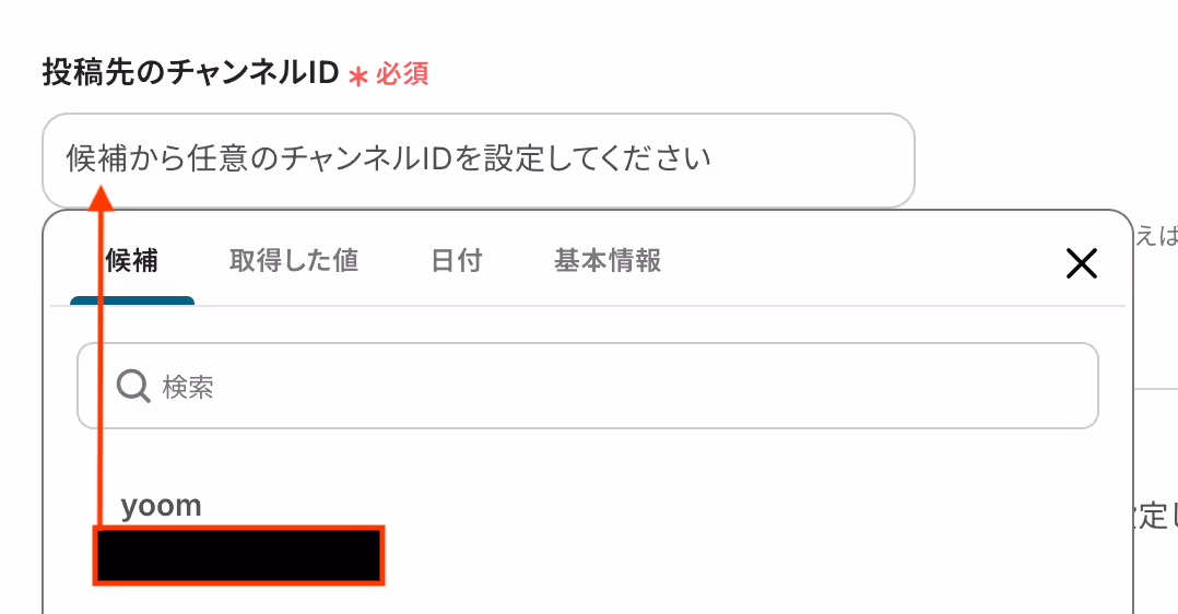 入力欄をクリックすると連携が有効になっているアカウントから候補が表示されるので、対象の項目を選択しましょう。