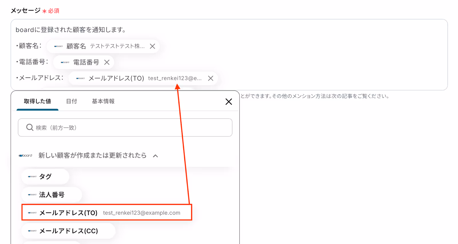 通知するメッセージの内容を設定しましょう。入力欄をクリックすると、前のステップで取得した値が表示されるので、選択して入力しましょう。