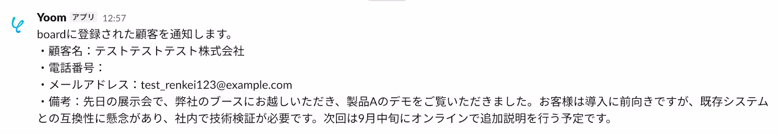 実際にboardで新規顧客を登録し、備考欄の要約が正しくSlackに通知されるかを確認してみましょう。