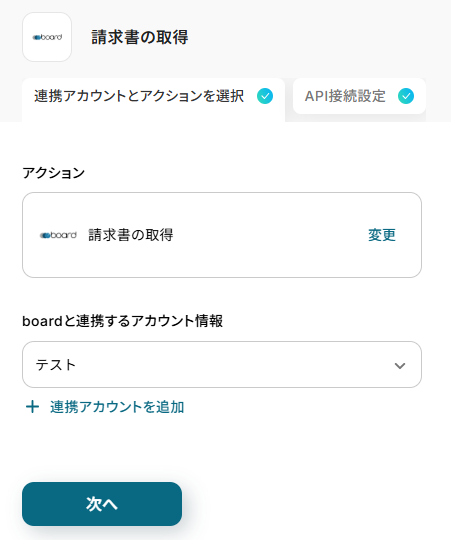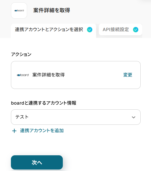 アクションはそのままにし、boardと連携するアカウントを確認したら「次へ」を押してください。