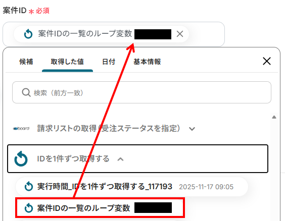 案件IDには、前のステップで取得した「案件IDの一覧のループ変数」を設定しましょう。