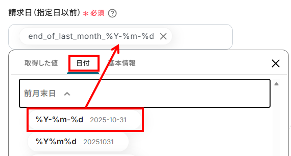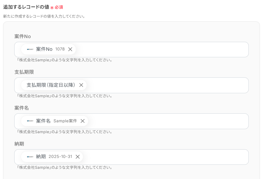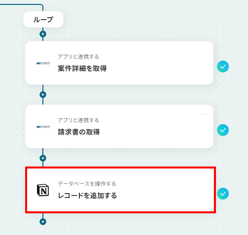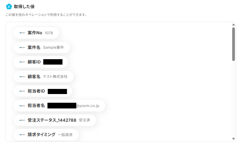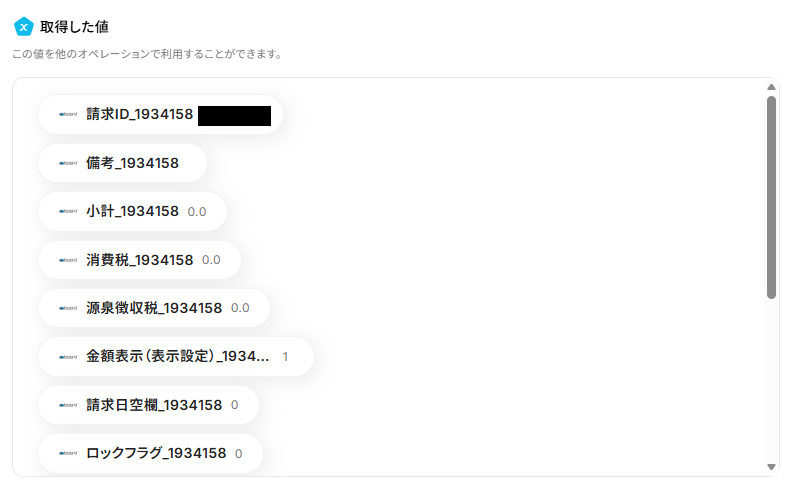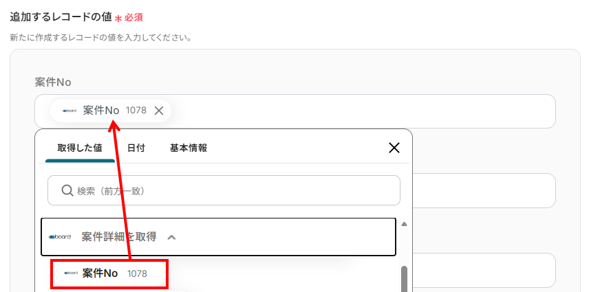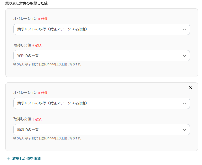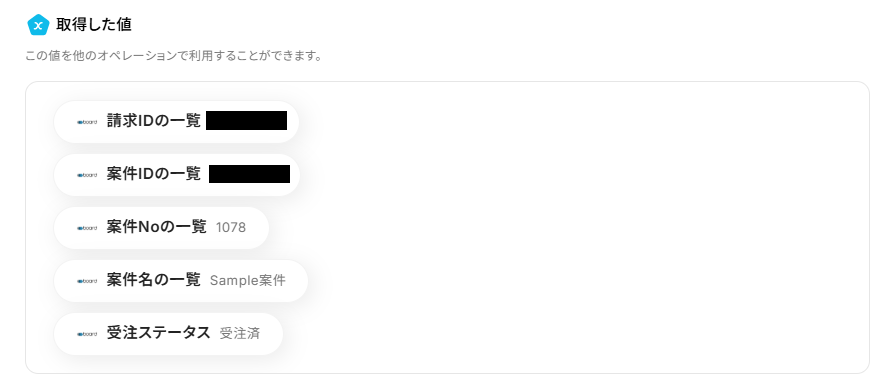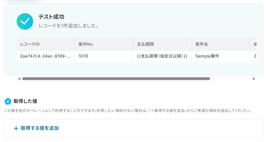 今回は、後続の案件取得と請求書取得のため、取得した値をこのように設定しましたが、「+取得した値を追加」を押して、取得する値を追加することも出来ます。