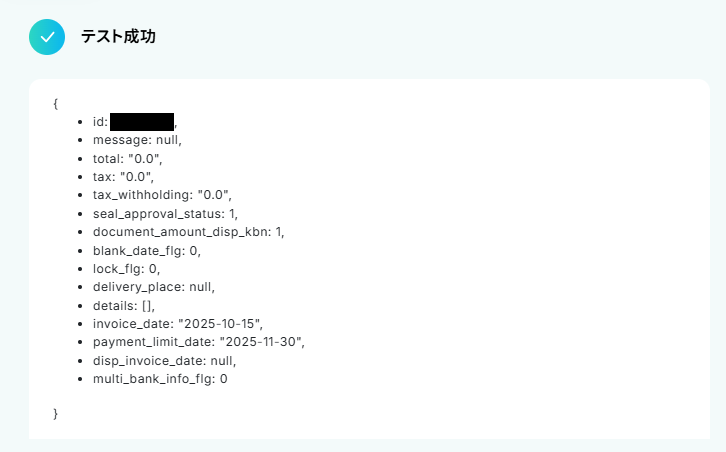入力できたら「テスト」を実行し、成功するか確認してみましょう。