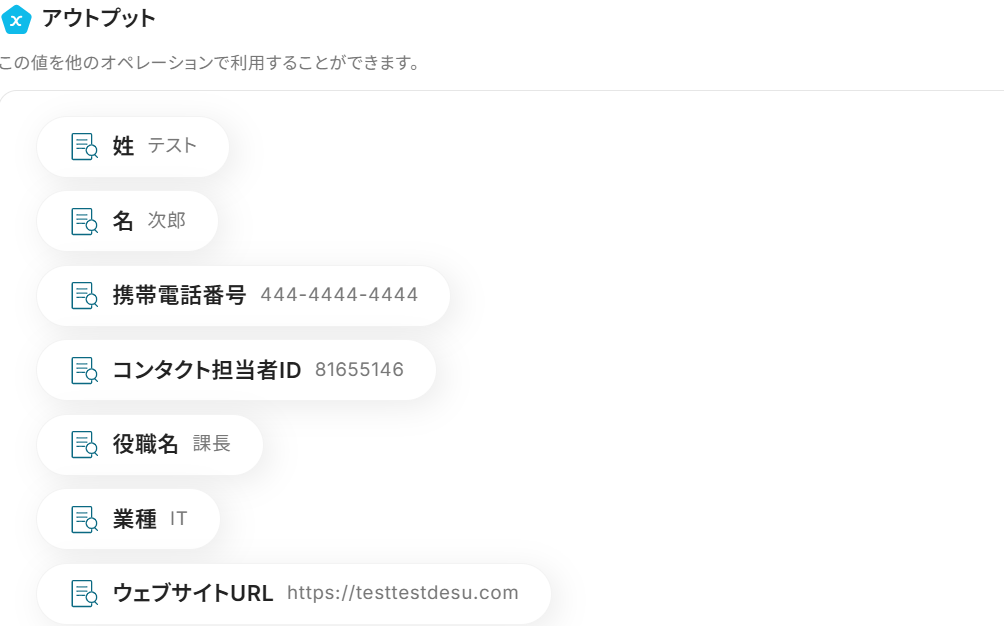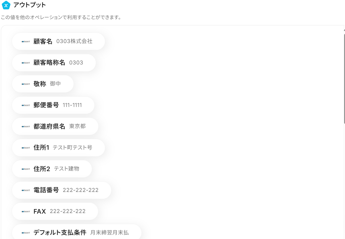 正しく連携できていると、画面下部のアウトプットに顧客情報が表示されます。