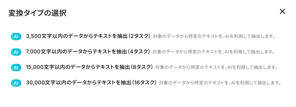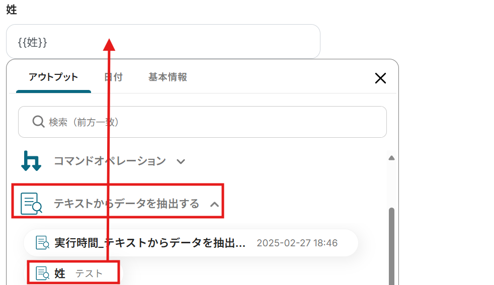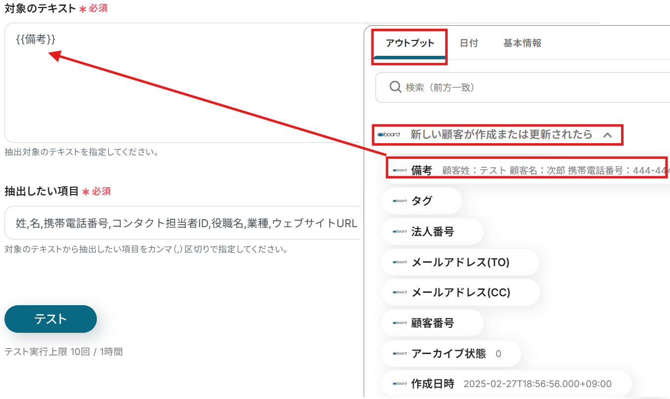 ここに固定のテキストを入れてしまうと、毎回それについて抽出されてしまうため、アウトプットから必ず選択してください。