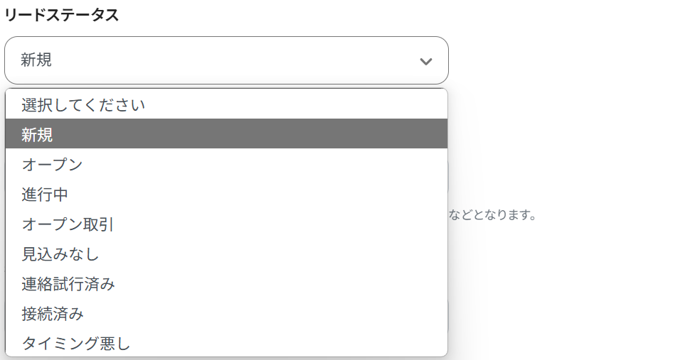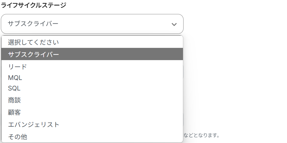 ライフサイクルステージやリードステータスは選択肢から選択してください。