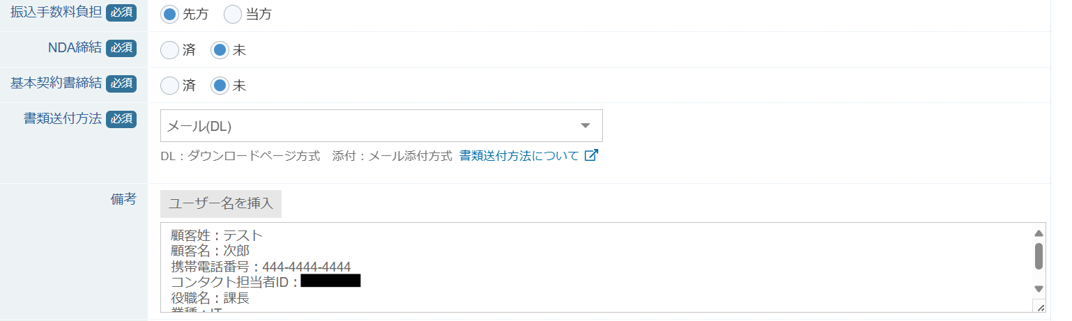 備考欄には、姓,名,携帯電話番号,コンタクト担当者ID,役職名,業種,ウェブサイトURLを入力しています。