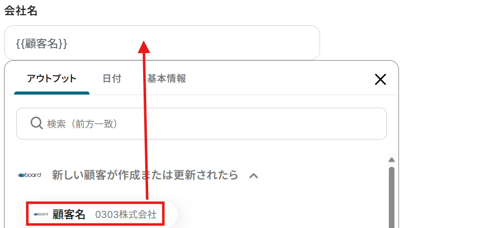 以下のようにboardのトリガーで取得した情報が表示されるので、該当欄をクリックします。