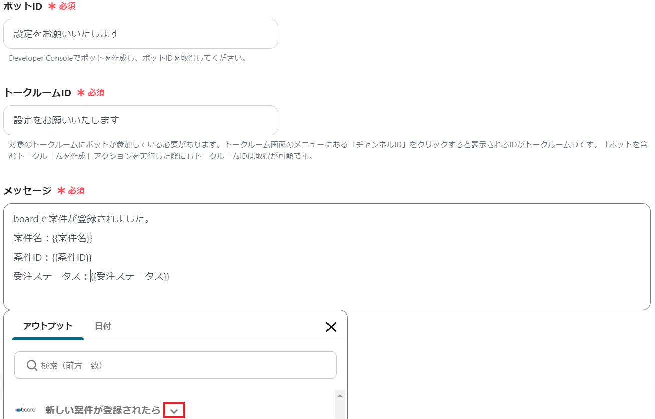 boardで案件が登録された際に、LINE WORKSに通知すれば案件に気づくことができます。