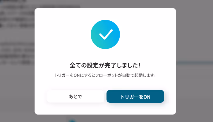 フロー画面に戻り、「全ての設定が完了しました!」と表示されていればフローの設定は完了です。