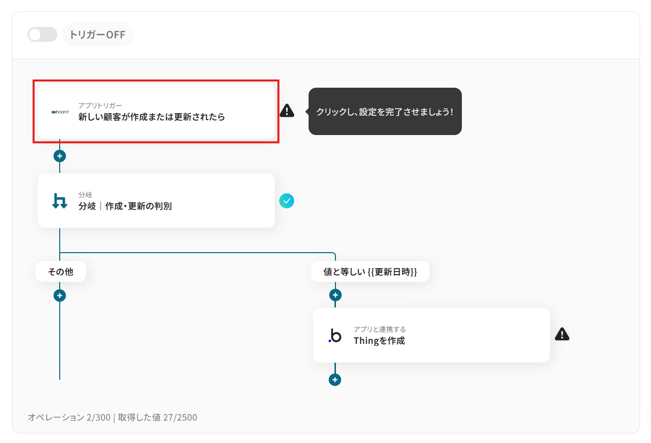 このフローは顧客の作成・更新時に稼働するため、作成時にのみThingの作成を行うよう設定しているのが次の分岐処理です。
