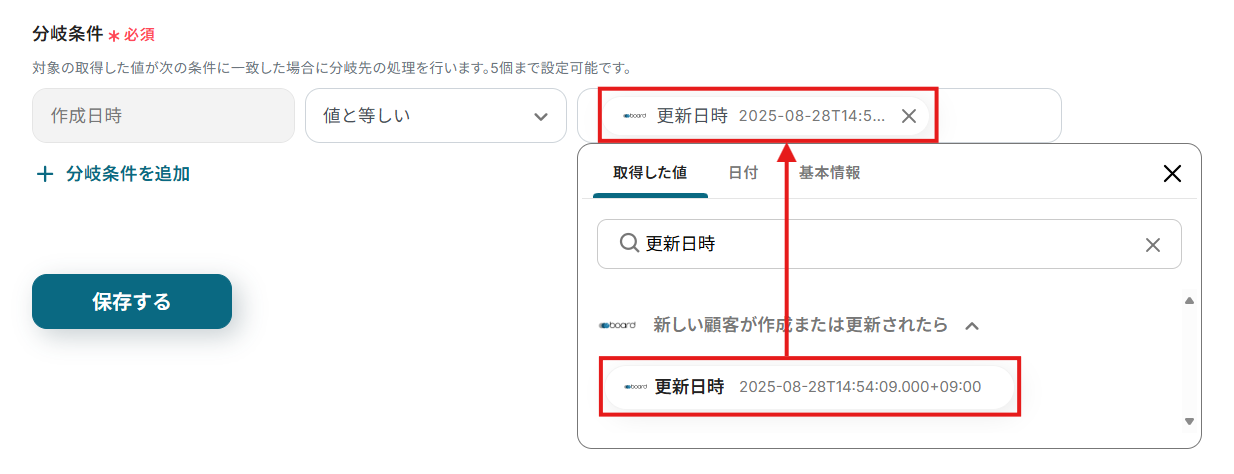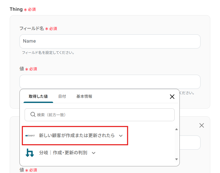 「分岐対象の取得した値」で「タグ」などを選択し、「分岐条件」にThingを作成したい顧客の条件を設定してください。