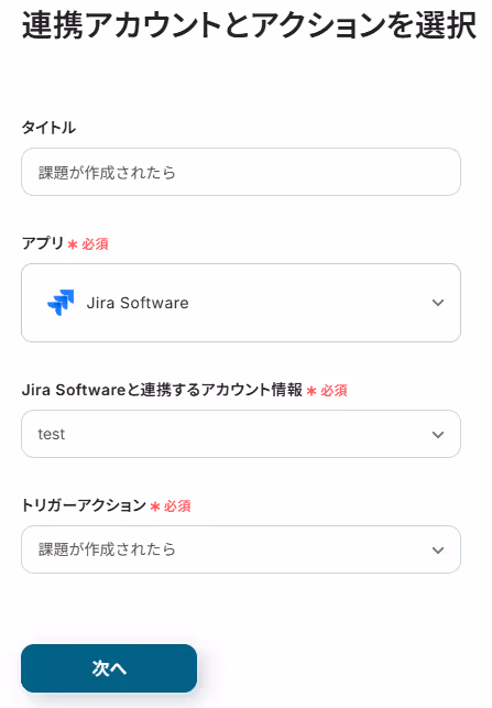 タイトルと連携するアカウント情報を任意で設定し、トリガーアクションはテンプレート通りに「課題が作成されたら」のまま「次へ」をクリックして進んでください。