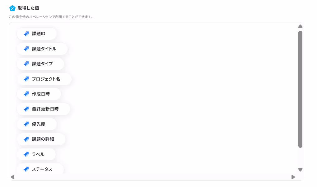 テストが成功した場合は、アウトプット(取得した値)を取得できます。実際の設定では、各項目に具体的な値が反映されます。