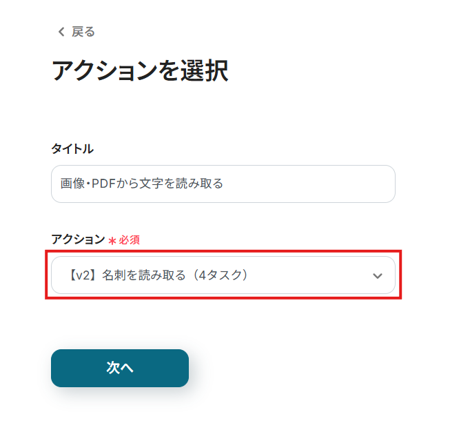 - 目的に応じて「アクション」をプルダウンから選択。読み取る対象や文字数によって消費するタスク数が変わります。