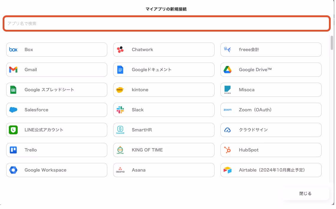 2)Yoomで接続できるアプリ一覧が表示され、一番上の検索窓から今回使用する「Box」を検索していきます。