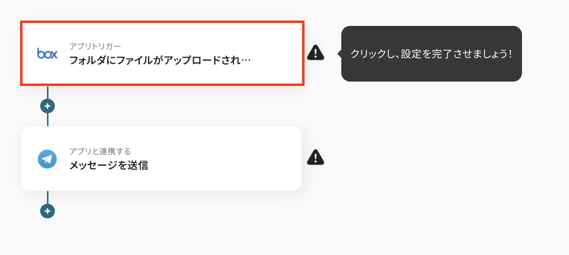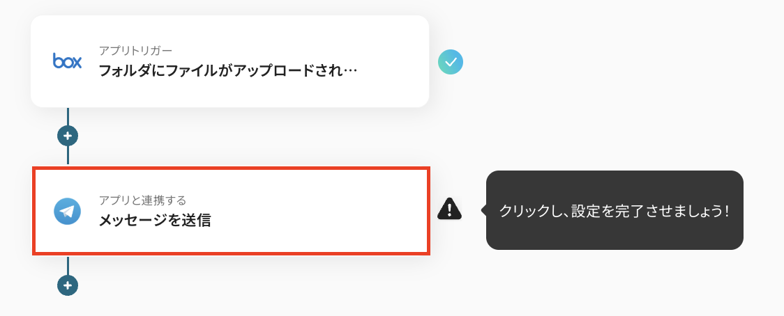 続いて、指定のBoxフォルダにファイルがアップロードされたことを、Telegramに自動通知する設定を行います。