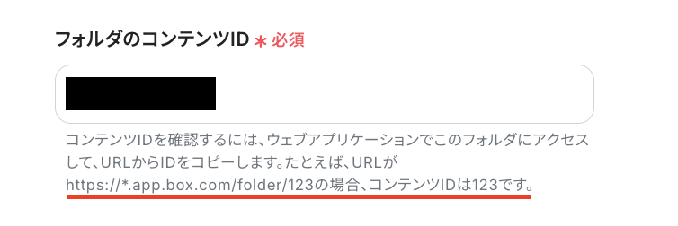 「フォルダのコンテンツID」を、入力欄下に記載されている内容を参考に入力しましょう。