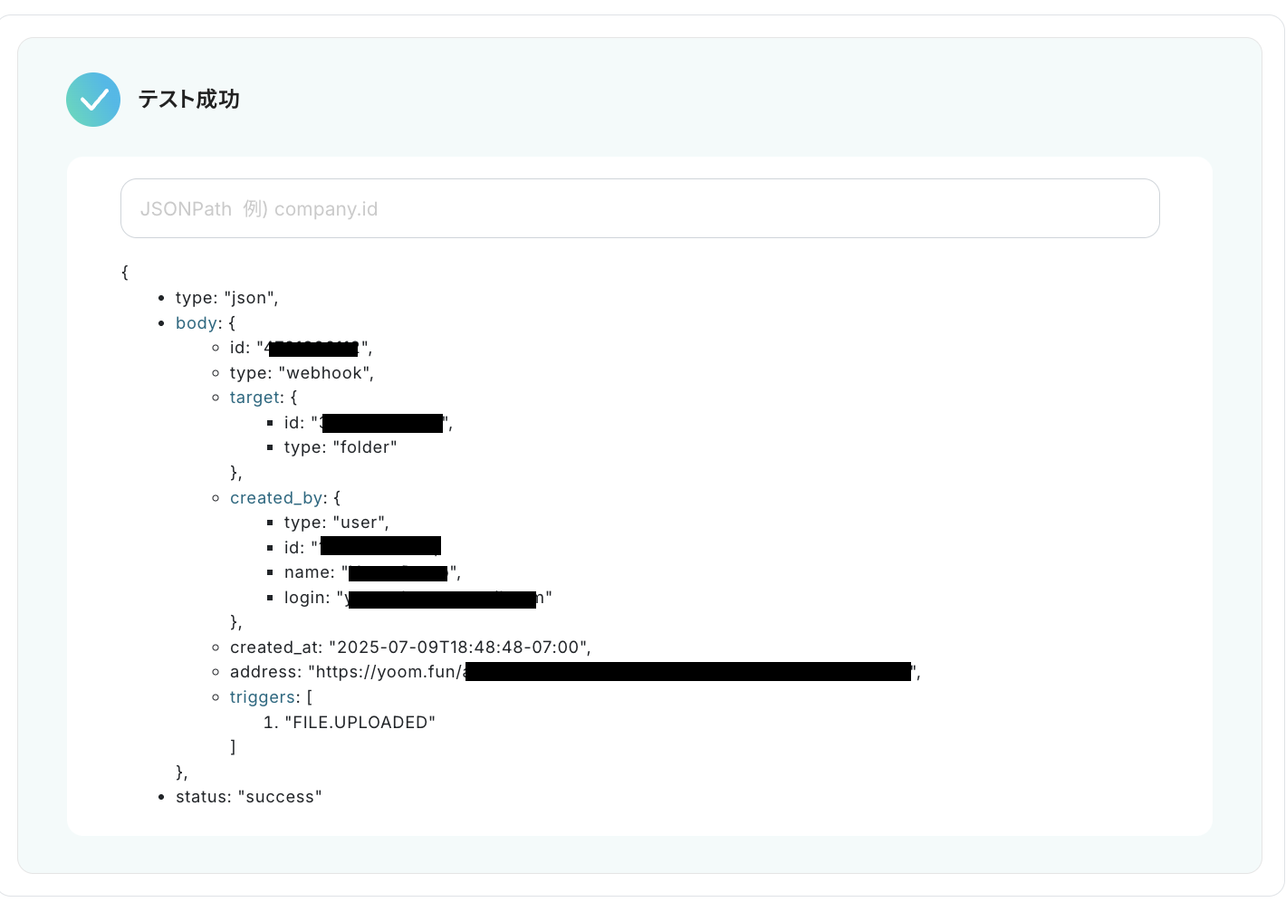設定が完了したら、指定したBoxのフォルダとYoomの連携チェックを行います。