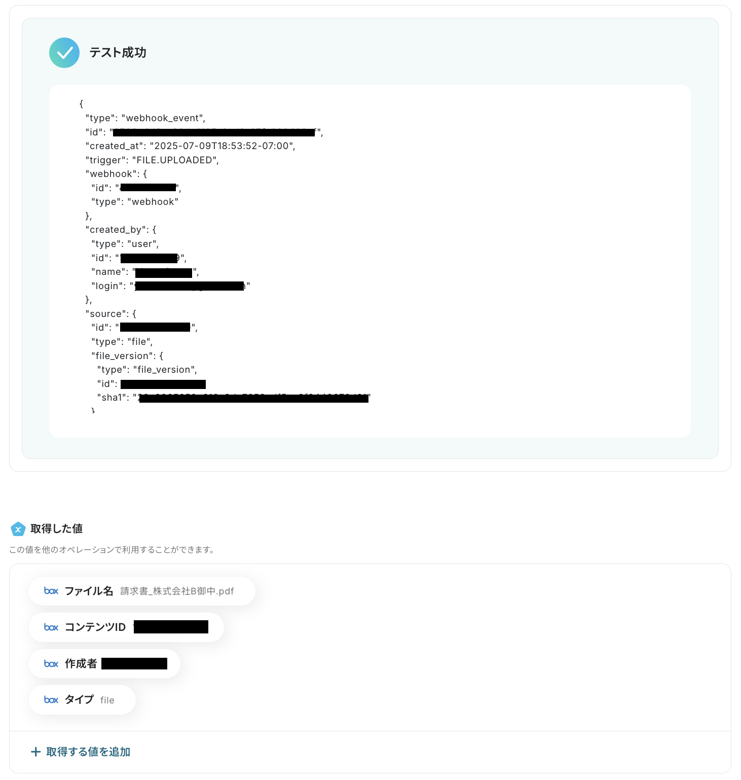 テストが成功すると、先ほどアップロードしたファイルの情報が「取得した値」にアウトプットとして抽出されるので、内容を確認しましょう。