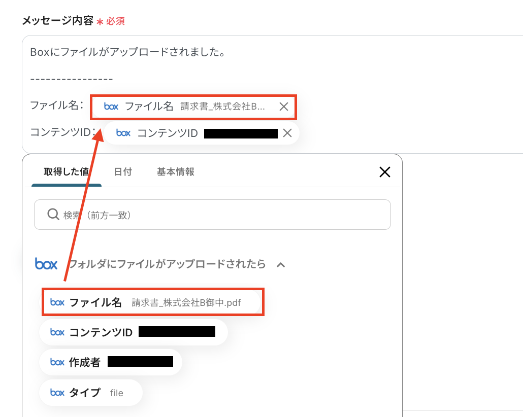 「ファイル名」など、Boxの情報を引用したい部分はアウトプットを使って設定しましょう。