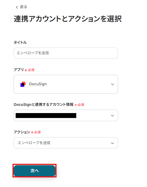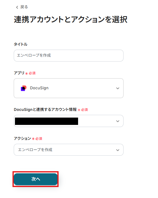 表示された画面で必須項目を入力し、「次へ」をクリックします。