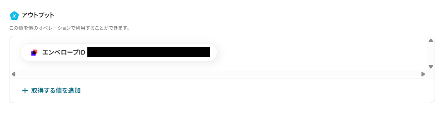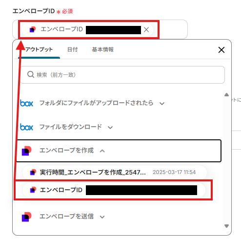 「エンベロープID」は、入力欄をクリックして表示されるアウトプットから選択してください。