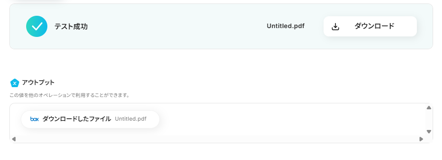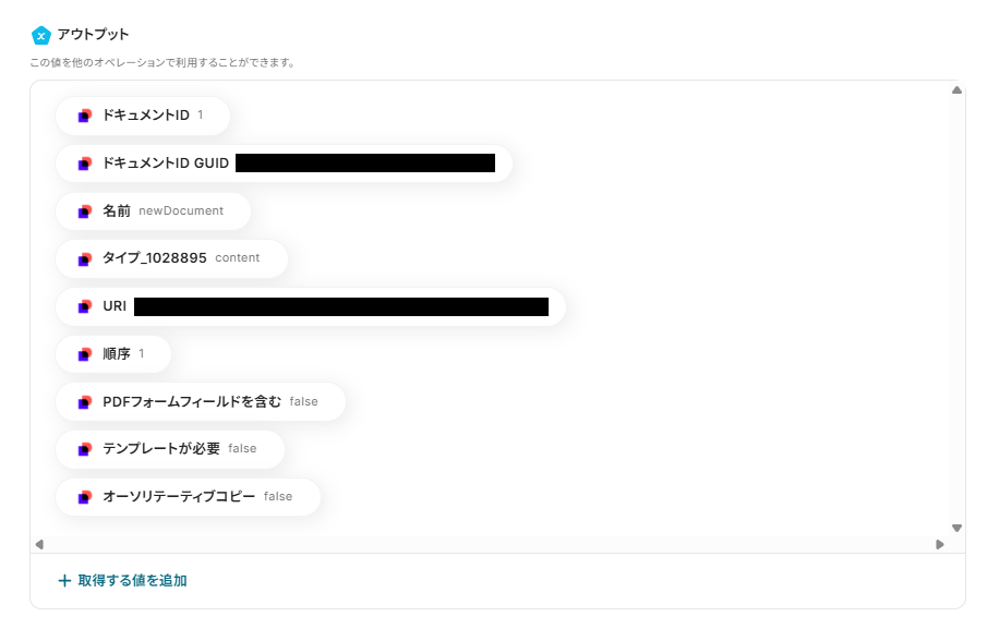 ※表示されているアウトプットは「この値を他のオペレーションで利用することができます。」と表記があるように、次の設定でも活用できます。