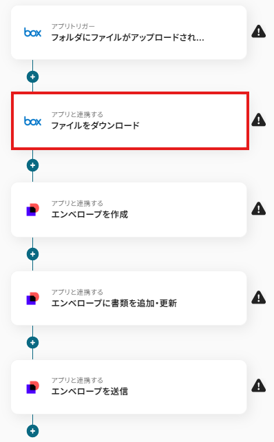 「BoxにアップロードされたファイルでDocuSignの署名依頼をする」フローは、文書の署名プロセスを自動化する業務ワークフローです。