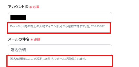 「アカウントID」「メールの件名」は、入力欄下の説明に従って、入力してください。