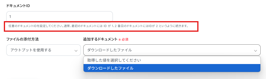 「ファイルの添付方法」「追加するドキュメント」は、プルダウンから選択してください。