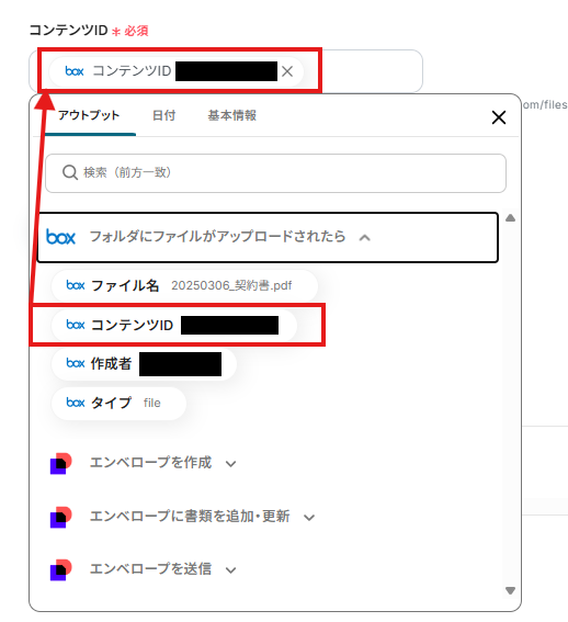 「コンテンツID」は、入力欄をクリックして表示されるアウトプットから選択してください。