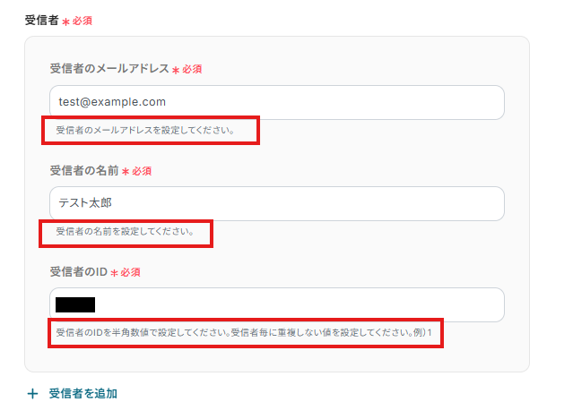「受信者」の各項目は、入力欄下の説明に従って、入力してください。