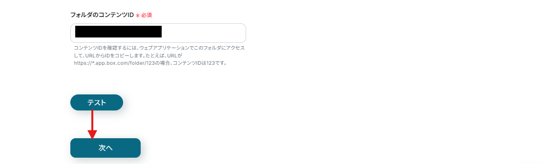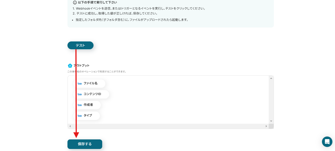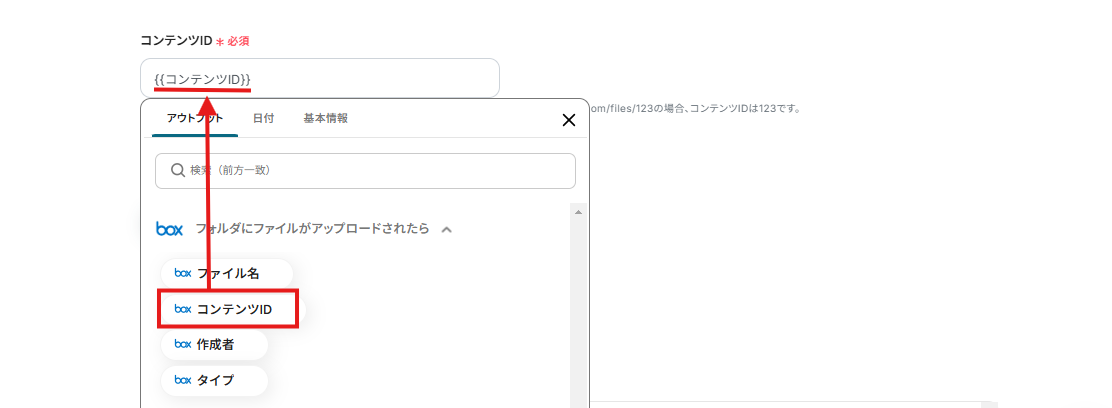 このように設定することで、Boxにファイルをアップロードされたら「コンテンツID」を自動で取得し、ファイルをダウンロードできるようになります。