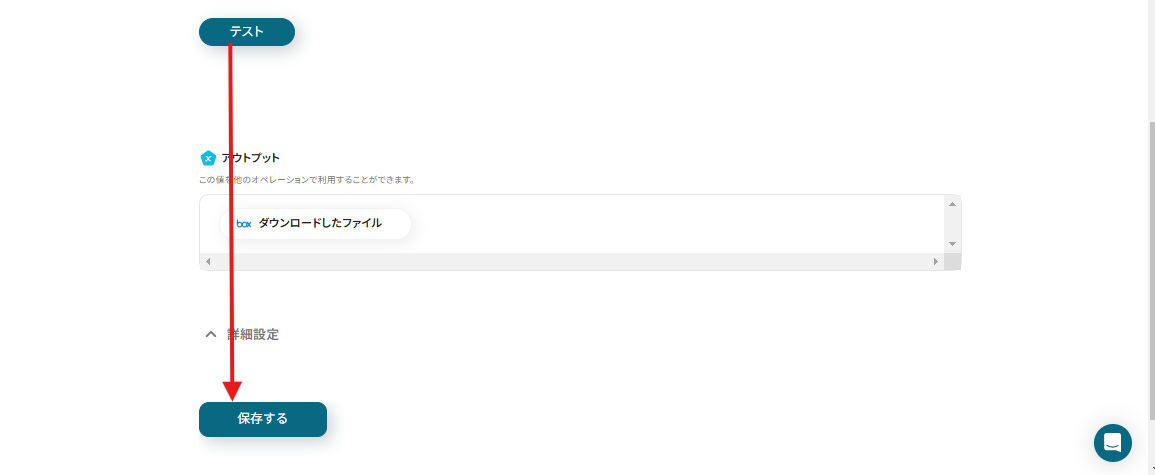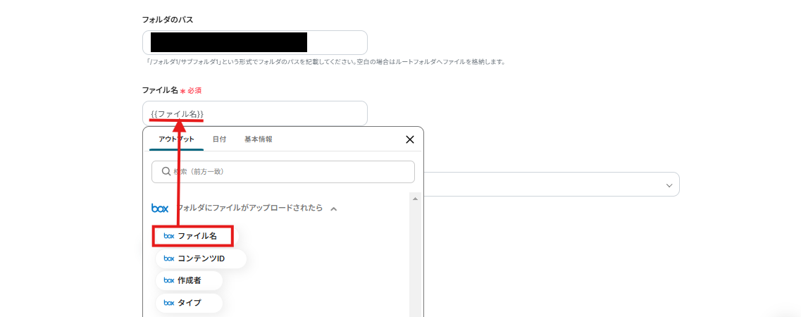 この設定により、Boxにアップロードされた「ファイル名」を自動で取得し、Dropboxのファイル名に引用することができます。