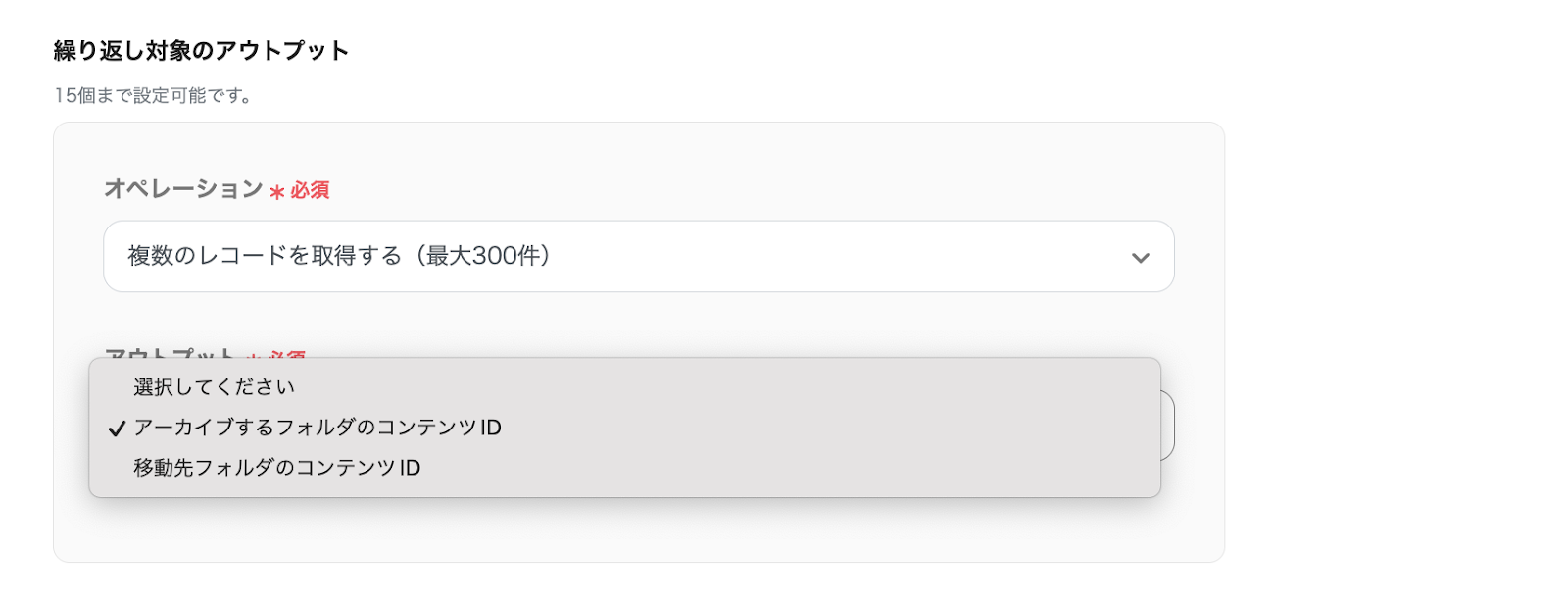 (2)『繰り返し対象のアウトプット』は15個まで設定可能です。