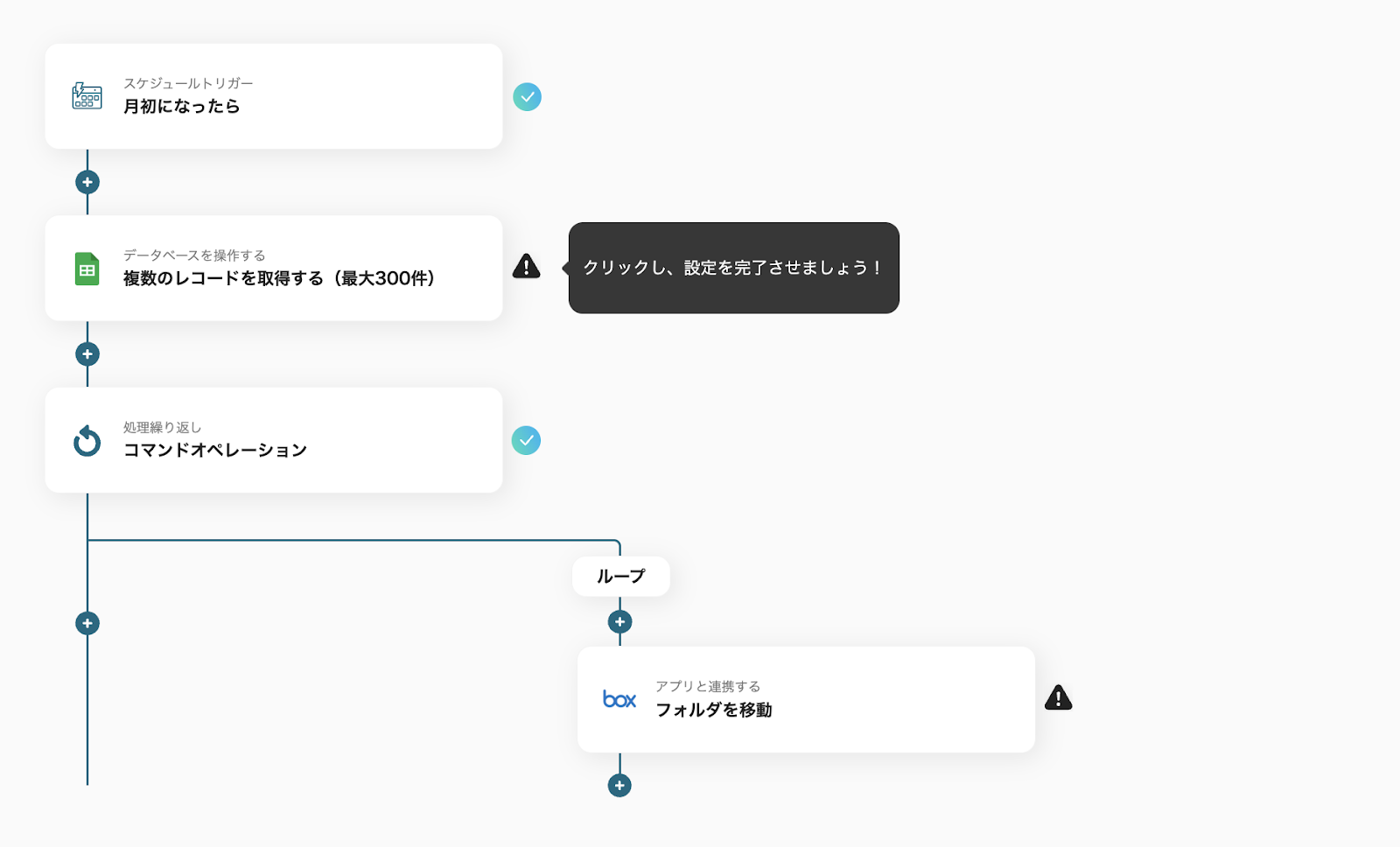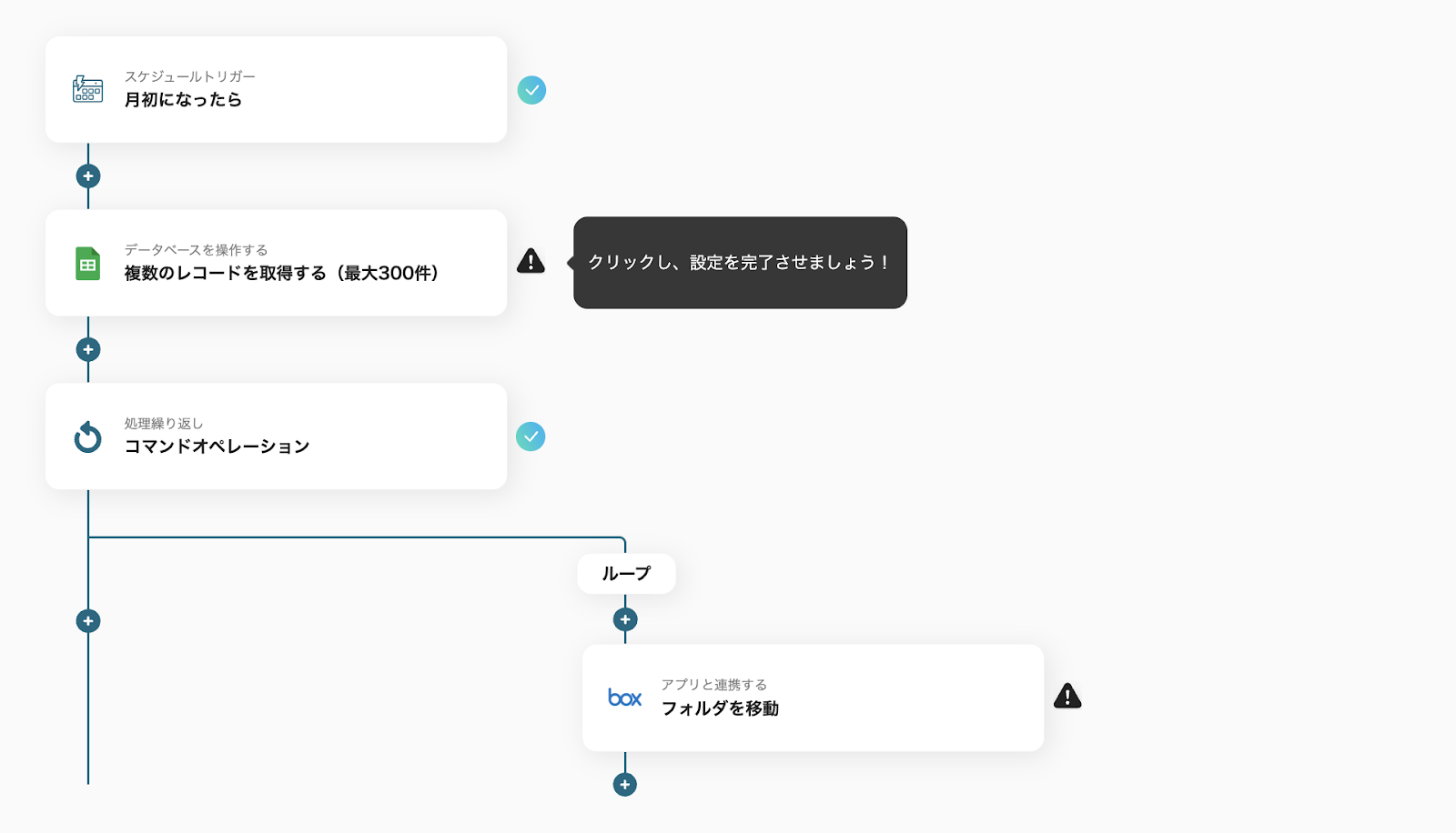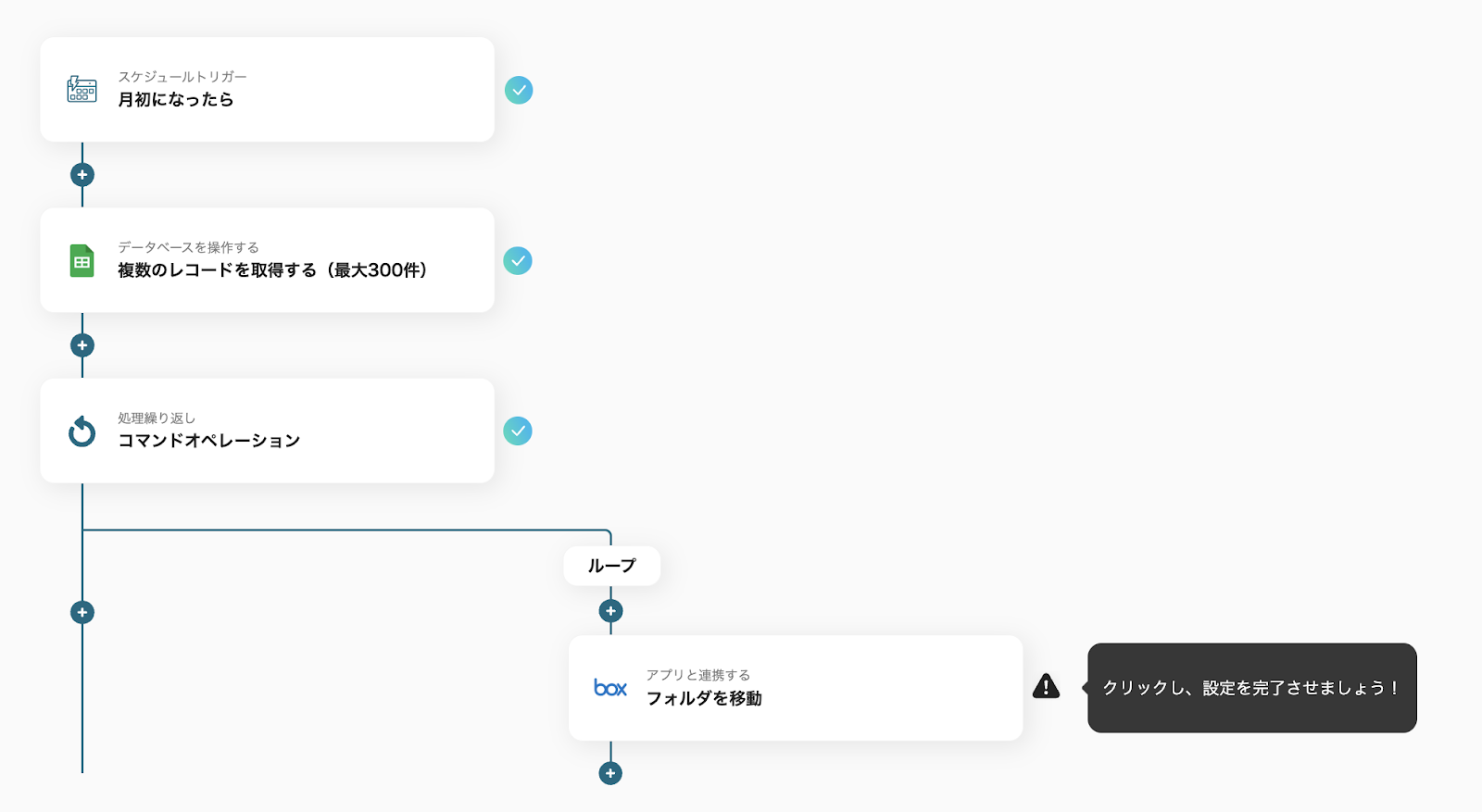 ・「同じ処理を繰り返す」オペレーション間の操作は、チームプラン・サクセスプランでのみご利用いただける機能となっております。フリープラン・ミニプランの場合は設定しているフローボットのオペレーションやデータコネクトはエラーとなりますので、ご注意ください。