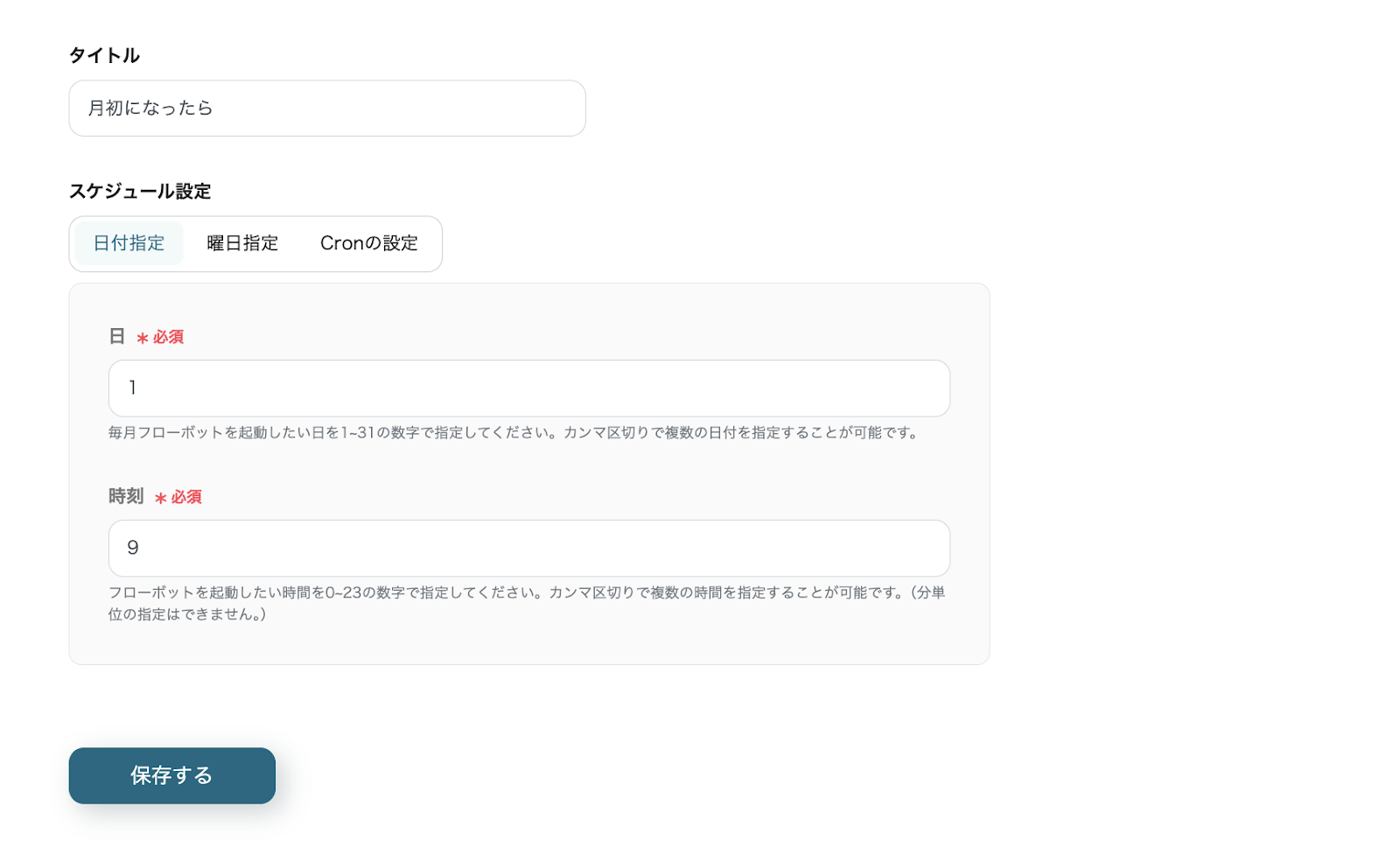 (3)今回は例として、『毎月初(1日)、9時になったら起動する』という設定を行っています。