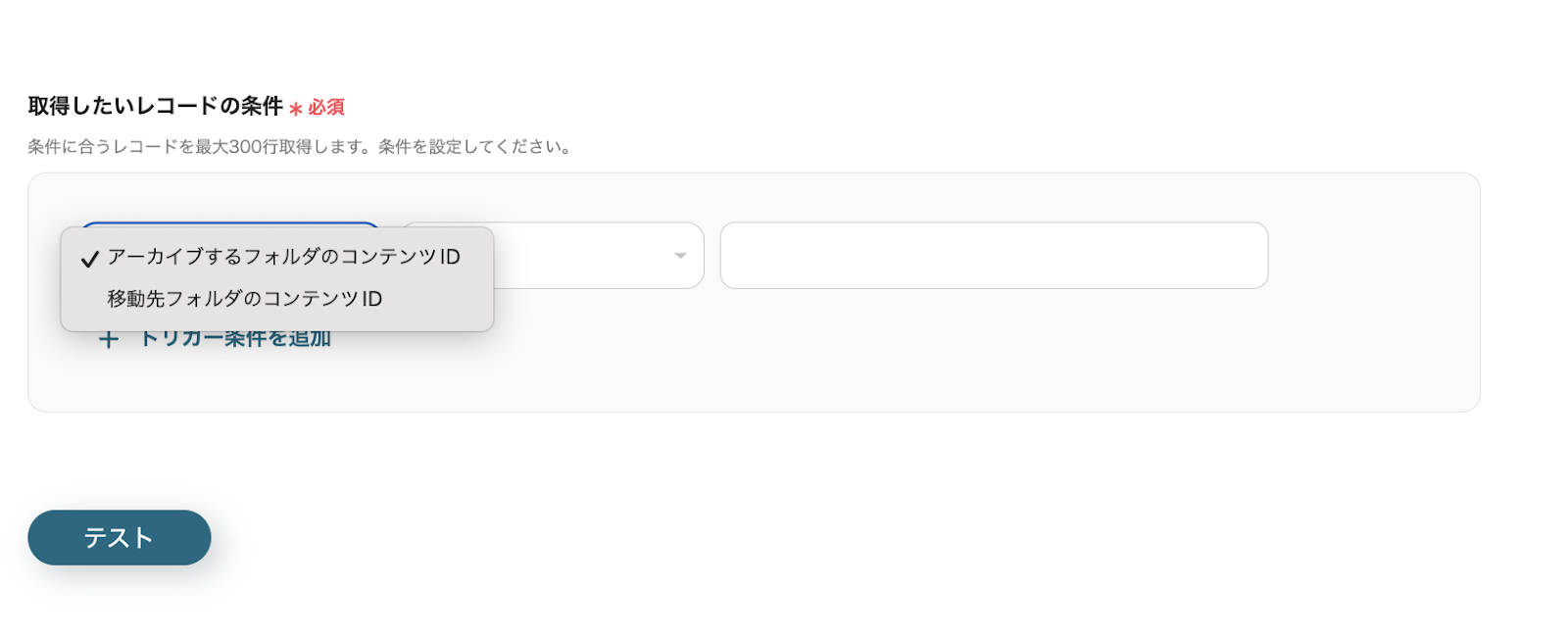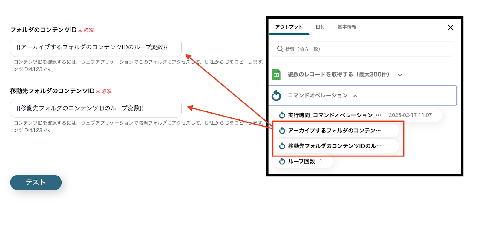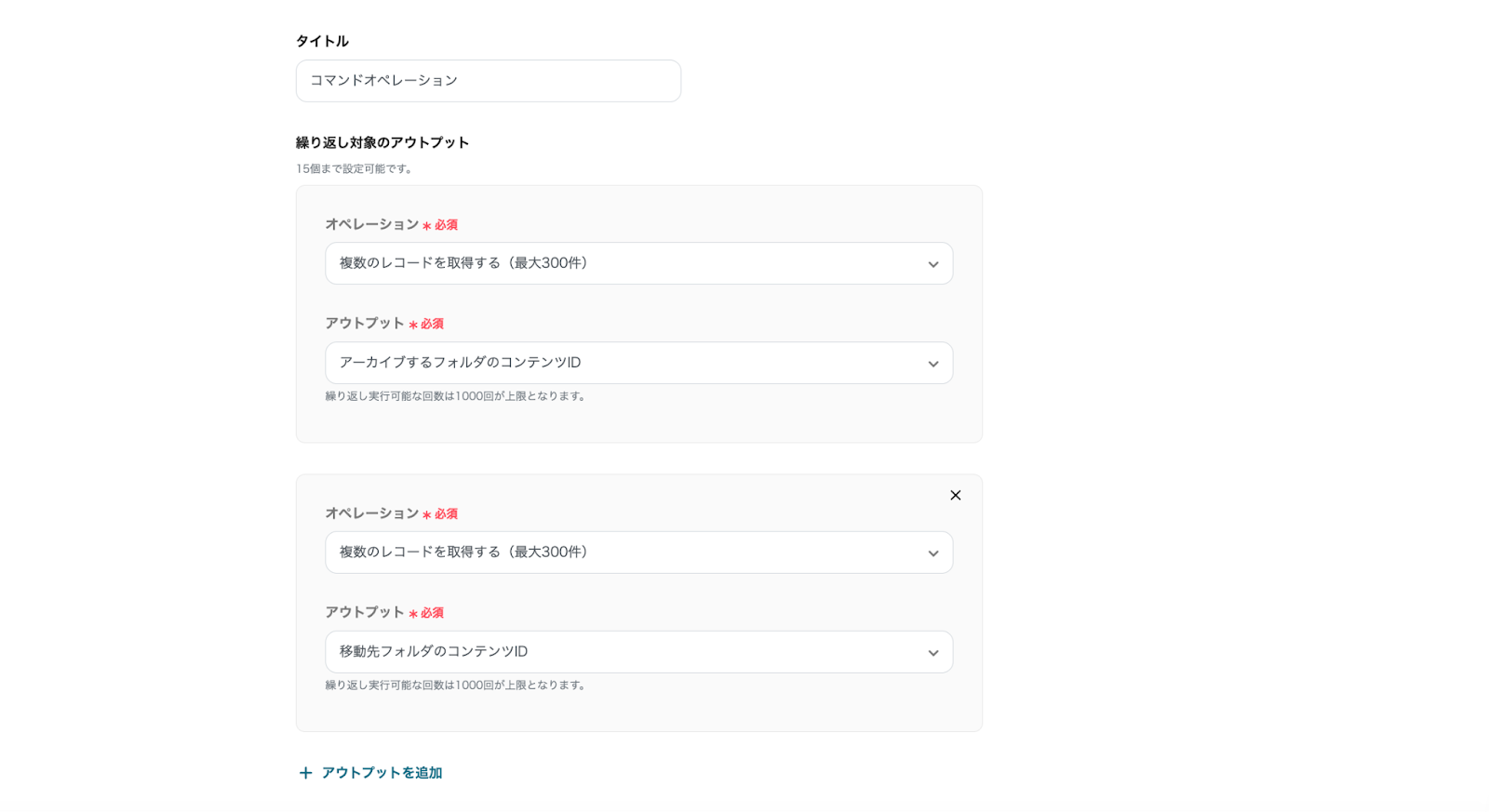 (3)今回はGoogle スプレッドシートのレコード【アーカイブするフォルダのコンテンツID】と【移動先フォルダのコンテンツID】を「アウトプット」に設定しています。