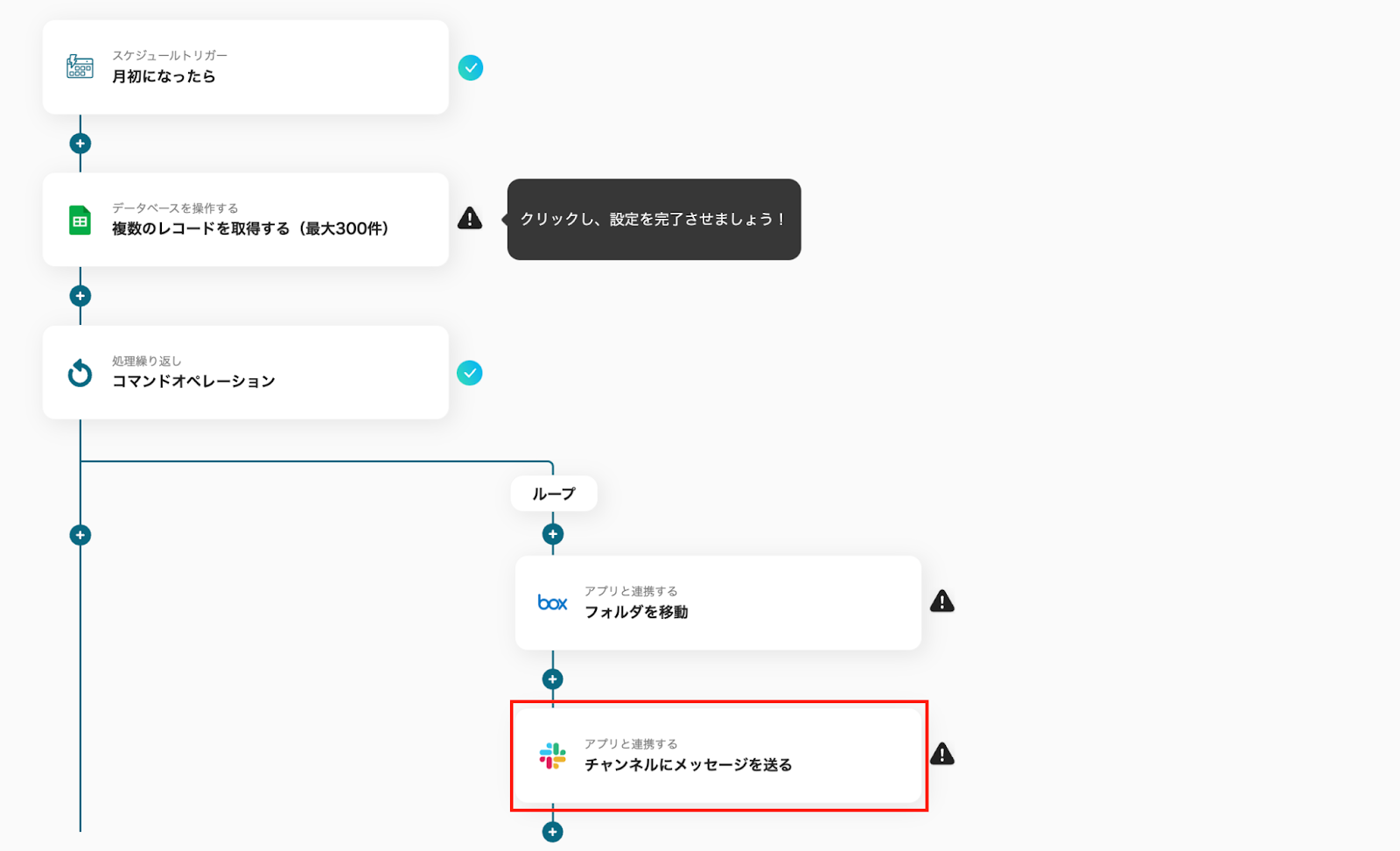 コピーが完了したら、ステップ4のBoxの特定フォルダを移動するまでは同じステップになるので、そのあとのチャンネルにメッセージを送るSlackの設定から説明していきます。