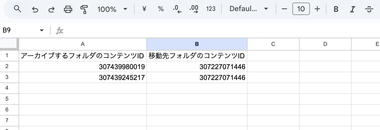 今回のフローボットは、Google スプレッドシートにアーカイブしたいフォルダIDと移動先フォルダのIDを記載されていることで起動します。